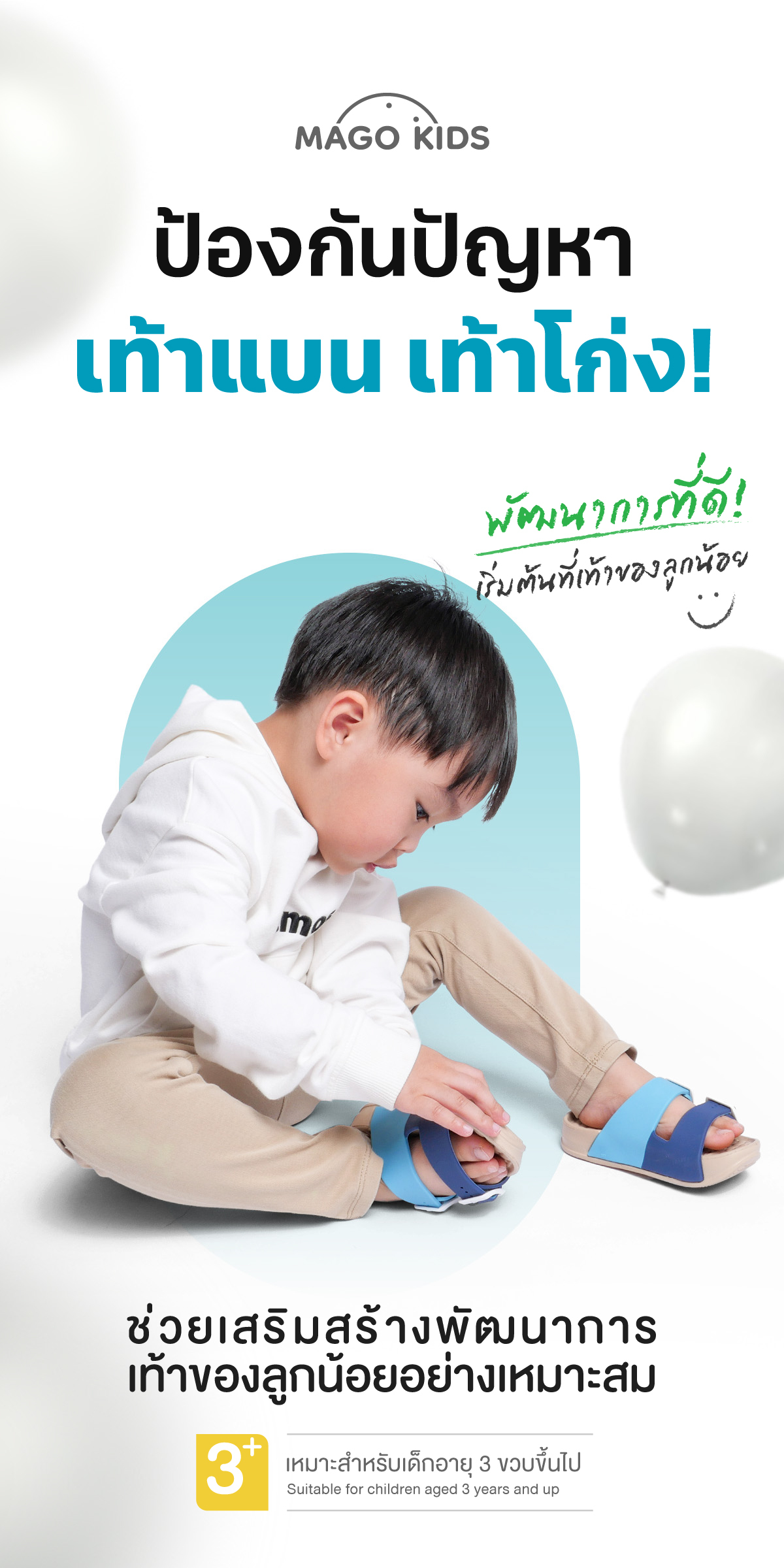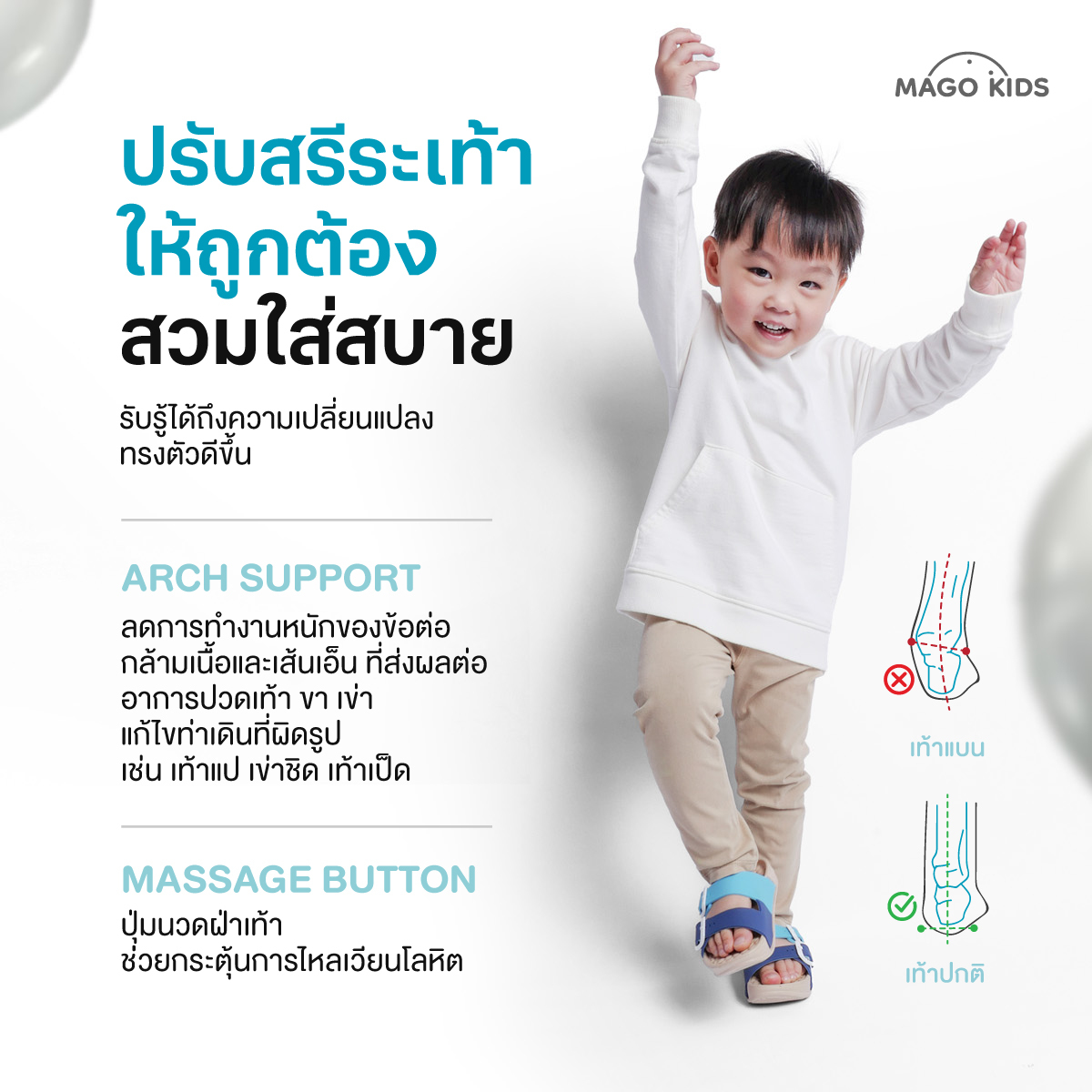 เท้าของเด็กน้อย... สำคัญกว่าที่คิด ปัญหาสุขภาพเท้าที่คุณพ่อคุณแม่ควรรู้ เท้าของเด็กน้อย นั้นเปรียบเสมือนรากฐานสำคัญในการเจริญเติบโตและพัฒนาการทางร่างกาย เพราะเป็นอวัยวะที่ต้องทำงานหนักในการเดิน วิ่ง และกระโดด ซึ่งหากเท้าของเด็กมีปัญหาสุขภาพ ก็อาจส่งผลกระทบต่อการเคลื่อนไหว การทรงตัว และการเจริญเติบโตในระยะยาวได้